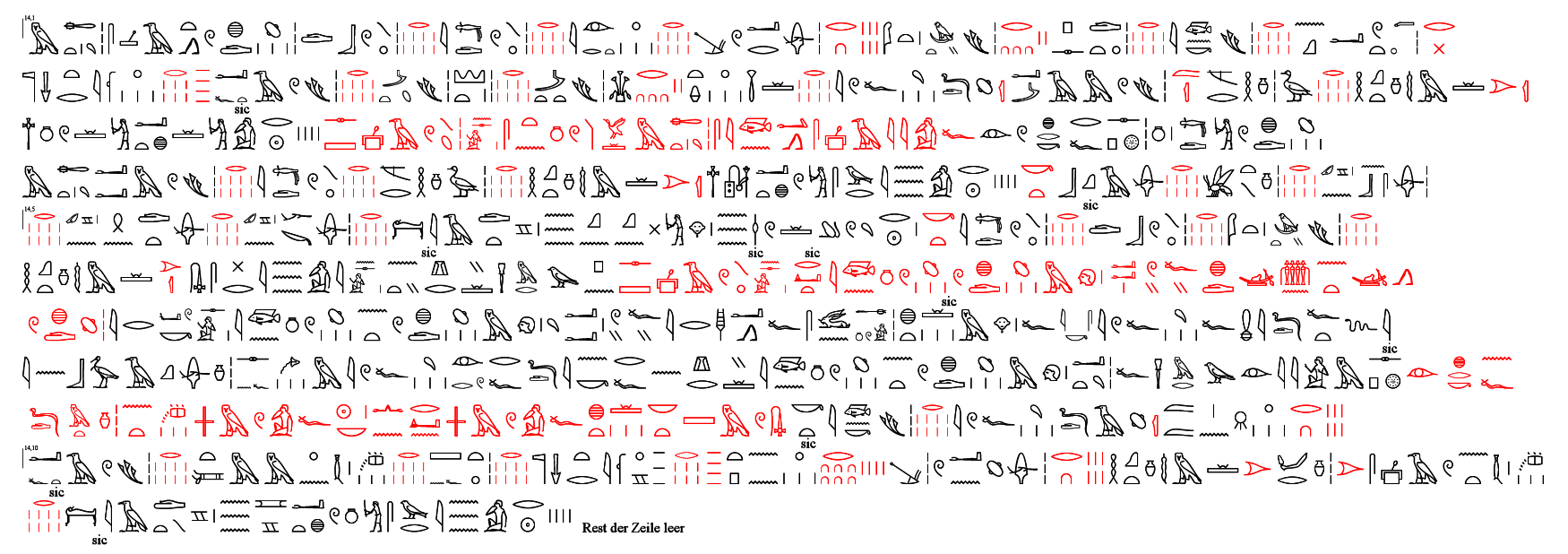 Rezept Nr. 162 (14,9 – 14,11) Ein anderes [Heilmittel]: jnnk-Pflanze 1/8, fettes Fleisch 5 ro, die beiden Hälften der psD-Frucht 1/16, {14,10} afA-Pflanze 1/8, ganze Dattel 1/8, Snft 1/8, Weihrauch 1/64, Kümmel 1/64, Wacholderbeeren 1/16, süßes Bier 20 ro, Dsrt-Bier 20 ro, zerschnittene Stücke der Dattel {14,11} 1/8; nachts dem Tau aussetzen, es werde durchgepresst, trinken an vier Tagen.