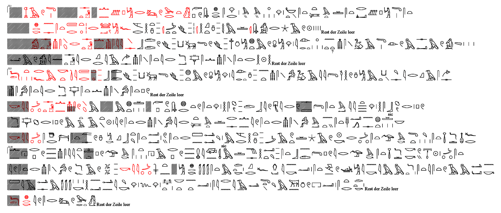 * Gardiner D52 mit Ideogrammstrich oder Gardiner D53, Lesung unklar, in diesem Zusammenhang aber möglicherweise mtwt – "Samen" ** Ob hier - wie so oft - die Beräucherung der Schamgegend bzw. Vulva anstelle der Gebärmutter gemeint ist?