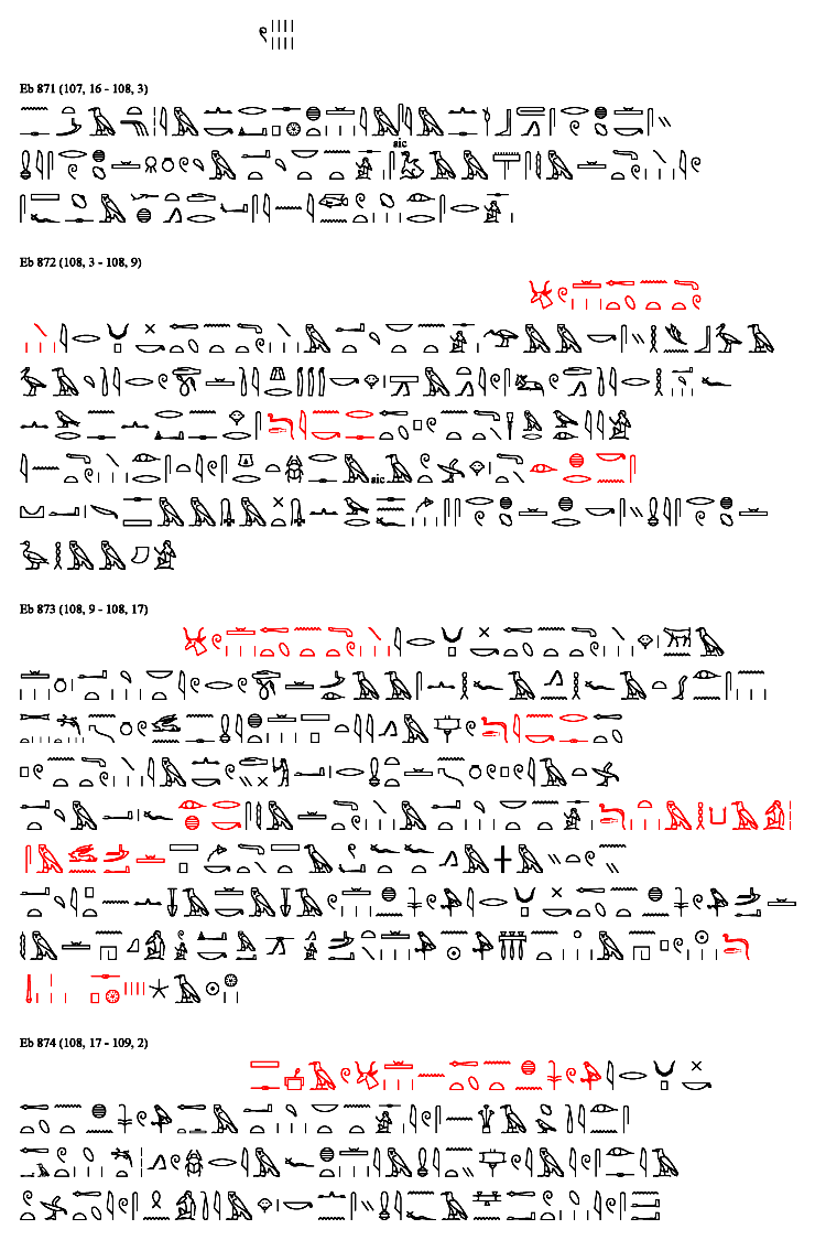 Eb 871 (107, 16 - 108, 3) {108, 1} ... eine Hauttasche, nicht lasse zu den Fall, daß etwas in ihr (bleibt), (denn) sie soll nicht zurückkehren. Du mögest sie behandeln {108, 2} wie das Behandeln einer Wunde an irgendeinem Körperglied eines Mannes, sie sich überziehen lassen und die Gefäße lindern. {108, 3} Sie schwillt (übrigens) an, nachdem sie beseitigt ist; es sind die jnwt-Krankheitsstoffe, die es machen gegen den Mann.