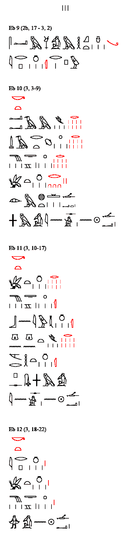 pEbers 12 (3, 18 - 3, 22) {3, 18} Ein anderes [Heilmittel]: {3, 19} Wein 1, {3, 20} Honig 1, {3, 21} Snj-tA-Frucht 1, {3, 22} durchpressen, trinken an einem Tage.