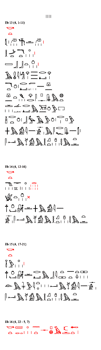 pEbers 14 (4, 12 - 4, 16) {4, 12} Ein anderes [Heilmittel]: {4, 13} Snj-tA-Frucht 1/8, {4, 14} Honig 1/4, {4, 15} fein zerreiben, essen durch {4, 16} den Mann, herunterschlucken mit süßem Bier.