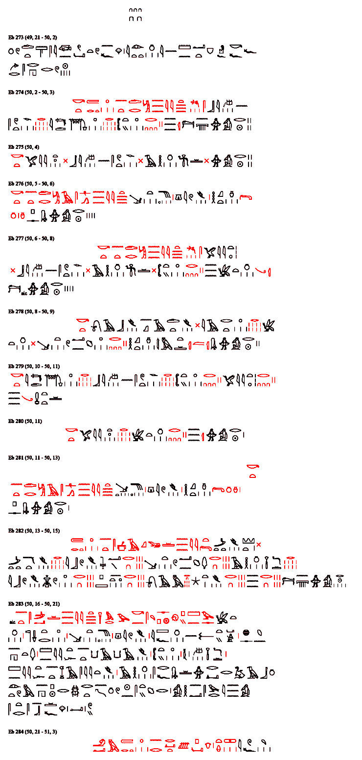 3. Ebenfalls in Zeile 50, 15 ist das letzte Zeilendrittel gelöscht worden und mit der Wortfolge mw 1/16  sDr n  jAdt  atx swr r  hrw 4 überschrieben. Der Löschung fiel wohl aus Versehen auch der Anfang von Rezept 283 (wahrscheinlich kt und/oder pXrt) zum Opfer.
