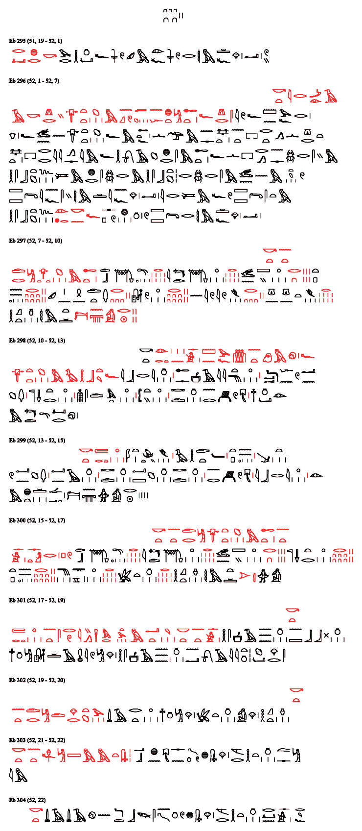 Eb 296 (52, 1 - 52, 7) Ein anderes [Heilmittel]: Wenn Du betrachtest einen, {52, 2} der beladen ist mit Schleimstoffen mit schneidenden Schmerzen, steif ist sein Bauch dadurch, und er leidet an {52, 3} seinem Magen: Es sind seine Schleimstoffe in seinem Bauch, nicht finden sie den Weg zum Herausgehen. Es ist aber auch kein {52, 4} Weg, aus dem sie herausgehen könnten. Dann verfaulen sie in seinem Bauch, sie können nicht herauskommen und sie werden zu {52, 5} Hsbt-Gewürm. Dann werden sie vollständig zu Hsbt-Gewürm, um zu werden zu Totem. {52, 6} Dann soll er sie ausscheiden, dann soll es ihm besser gehen sofort. Wenn er aufhört, sie auszuscheiden als {52, 7} Hsbt-Gewürm, dann sollst Du für ihn machen Mittel für das Ausscheiden, so daß es ihm besser geht sofort.