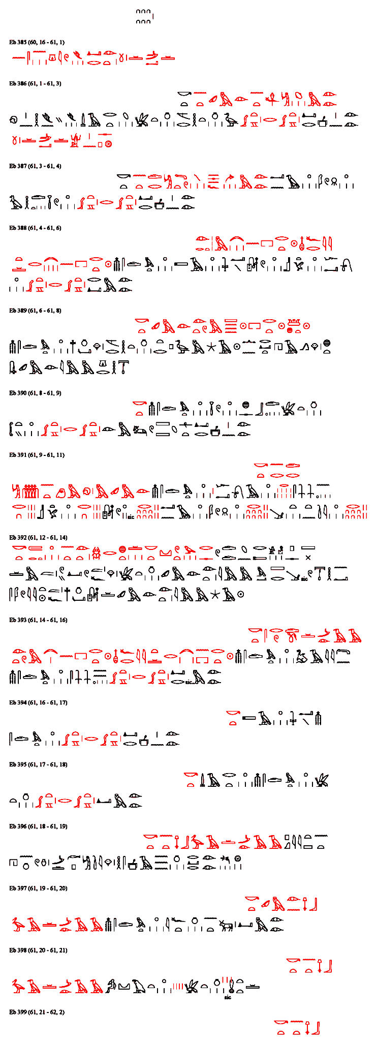 Eb 388 (61, 4 - 61, 6) Was gemacht wird vom dritten Monat der Peret-Jahreszeit {61, 5} bis zum vierten Monat der Peret-Jahreszeit: schwarze Augenschminke, oberägyptisches sjA-Mineral, Trw-Ocker, Htm-Mineral, xt-awA, {61, 6} zu gleichen Teilen, geben in die beiden Augen.