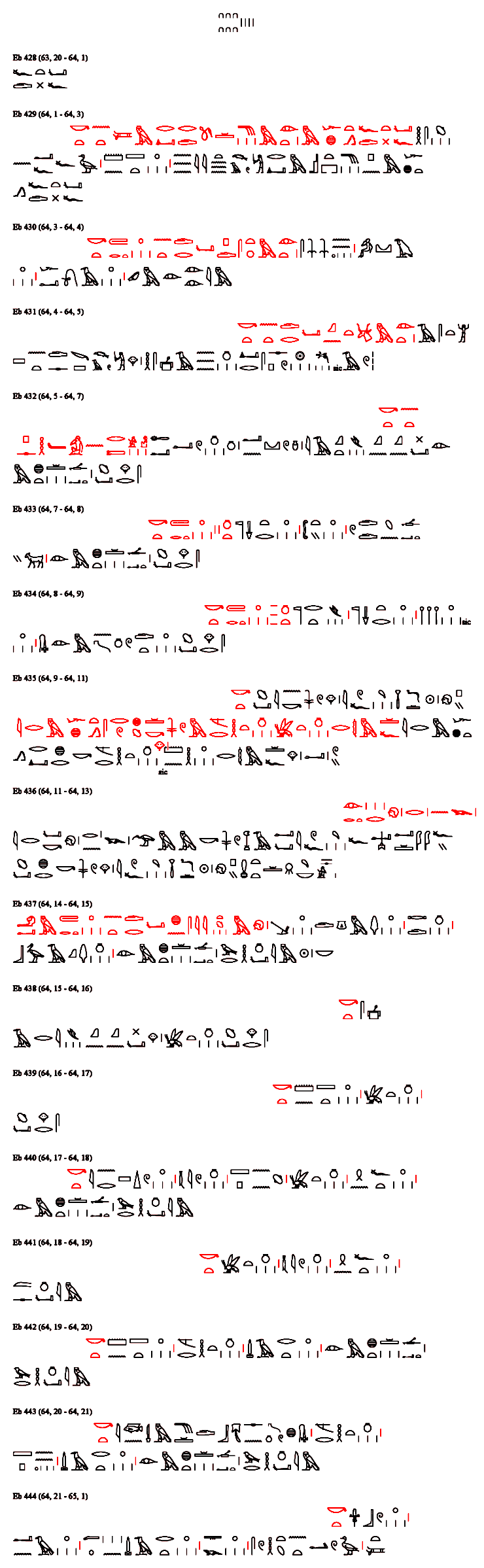 Eb 430 (64, 3 - 64, 4) Ein anderes Heilmittel für das Beseitigen eines "Kügelchen im Auge" (=Hordeolum?): snn-Balsam 1, schwarze Augenschminke {64, 4} 1, xt-awA 1, schminken die beiden Augen damit.