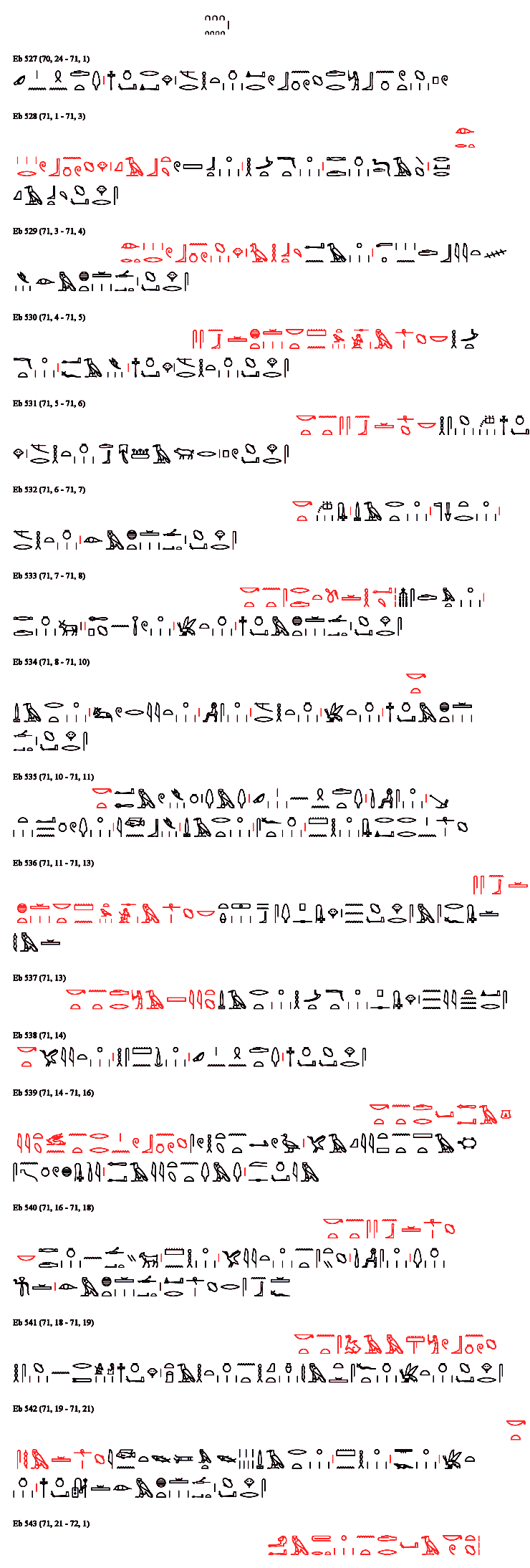 Bemerkungen: 1. In Rezept 534 (Zeile 71, 9-10) wurde die Wortgruppe nD m jx.t wa.t über einer Löschung geschrieben. 2. Das Zeichen Õ in Zeile 71, 15 wurde über einem zuvor gelöschten > geschrieben. 3. In Zeile 71, 19 ist die Wortgruppe Hno.t nDm.t gedrängt eine zuvor gelöschte Textlücke geschrieben worden.