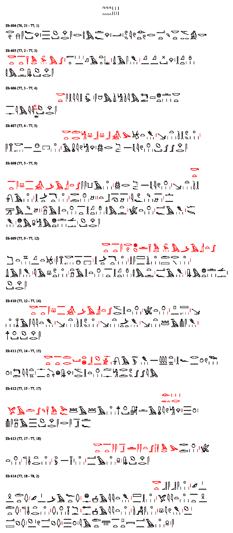 Eb 610 (77, 12 - 77, 14) Ein anderes [Heilmittel] für das Weichmachen des Knies: Fett 1, Honig 1, Rötel 1, Samen {77, 13} der xAsyt-Pflanze 1, Samen der Erbse 1, Samen des Selleries 1, Samen der SAms-Pflanze 1, {77, 14} zerreiben, verbinden damit.