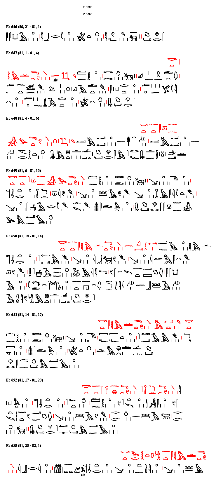 Eb 651 (81, 14 - 81, 17) Ein anderes [Heilmittel] für das Lindern der Gefäße in jedem Körperglied: {81, 15} Wachs 1, Rinderfett 1, prt-Snj 1, Schlamm 1, saAm-Pflanze 1, ns-{81, 16}S 1, schwarze Augenschminke 1, Honig 1, machen zu einer einheitlichen Masse, verbinden {81, 17} damit, (nachdem) gesalbt wurde mit Myrrhenharz.