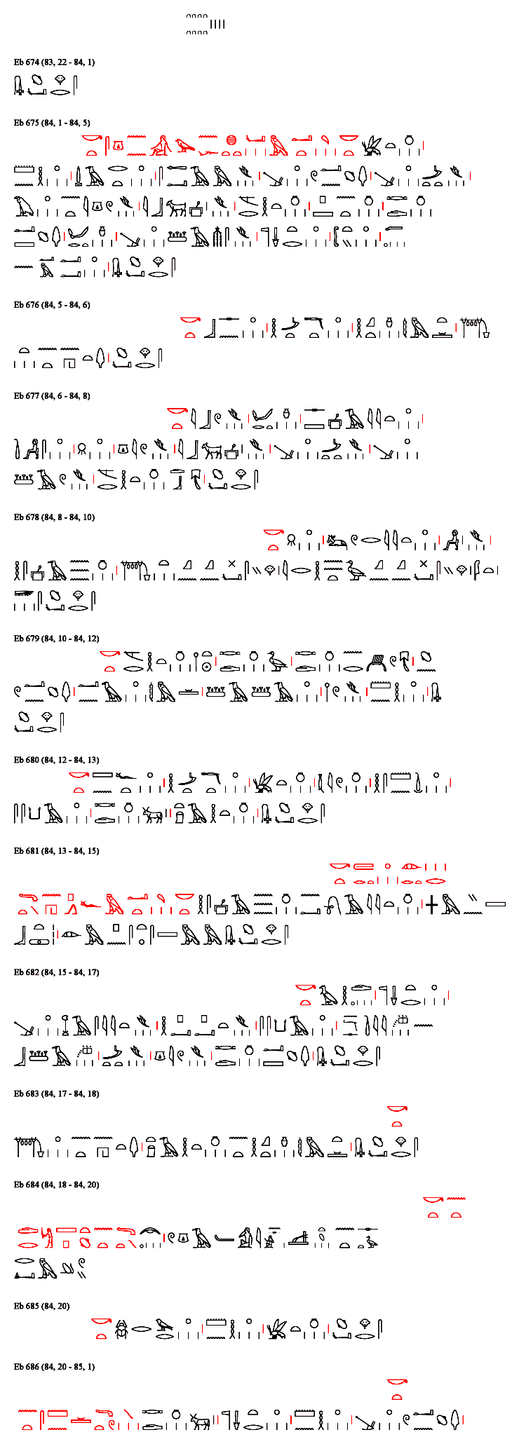 Eb 678 (84, 8 – 84, 10) Ein anderes [Heilmittel]: psD 1, jwryt-Bohnen 1, Sps-Pflanze 1, {84, 9} Pflanzenschleim 1, Früchte, die zerkleinert wurden auf einem jrHnnt-Vogel, der zerkleinert wurde auf {84, 10} seinen Federn, verbinden damit.
