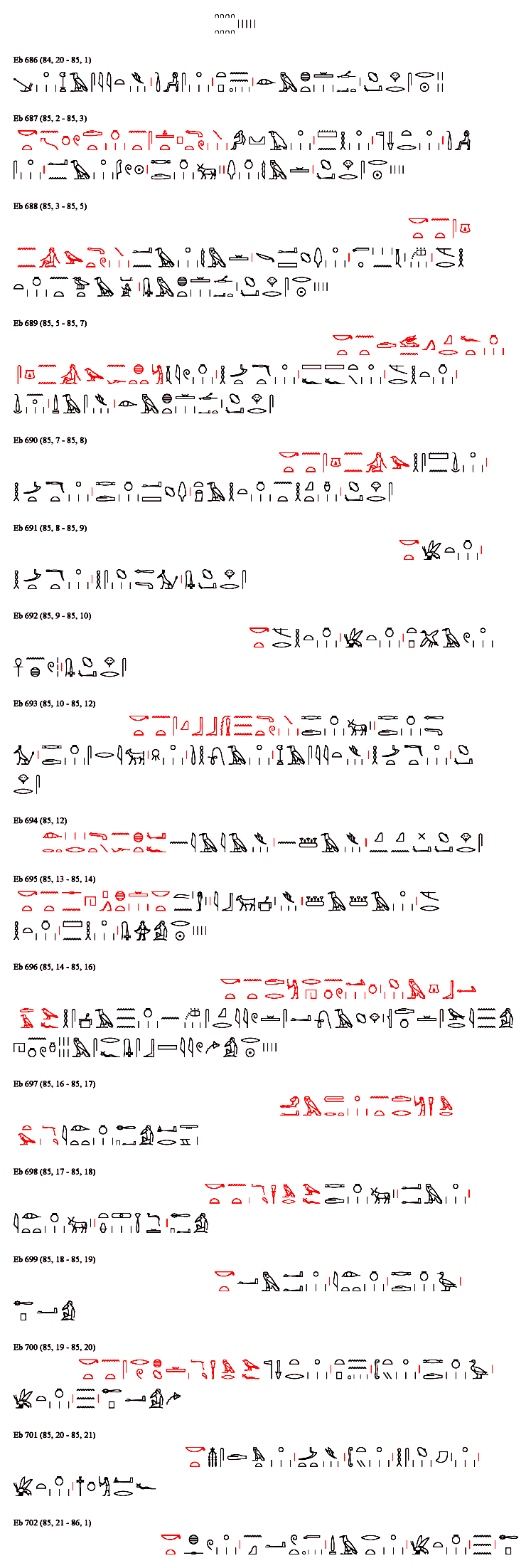 Eb 687 (85, 2 - 85, 3) {85, 2} Ein anderes Salbmittel für das Beruhigen der Gefäße: schwarze Augenschminke 1, Wachs 1, Weihrauch 1, tj-Sps-Pflanze {85, 3} 1, trockenes Myrrhenharz 1, Rinderfett 1, süßes Behenöl 1, verbinden damit an vier Tagen.
