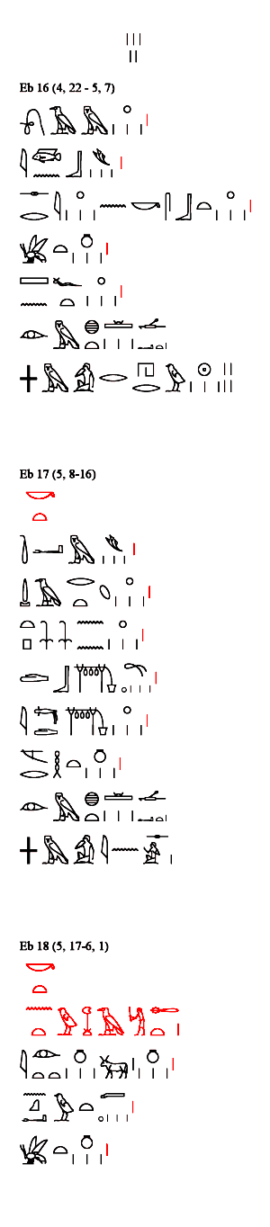 pEbers 16 (4, 22 - 5, 7) {5, 1}... wAm-Pflanze 1, {5, 2} jnb-Pflanze 1, {5, 3} sr-Teil des ksbt-Baumes 1, {5, 4} Honig 1, {5, 5} Snft 1, {5, 6} zu einer einheitlichen Masse machen, {5, 7} essen an vier Tagen.