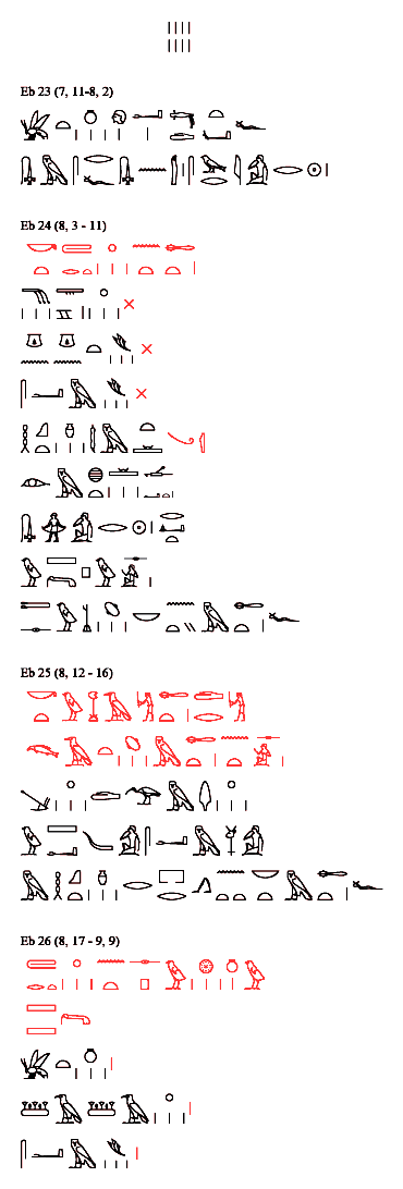 pEbers 26 (8, 17 - 9, 9) {8, 17} Heilmittel für Fälle von {8, 18} Ausscheiden: {8, 19} Honig 1, {8, 20} SASA 1, {8, 21} sam-Pflanze 1, ...