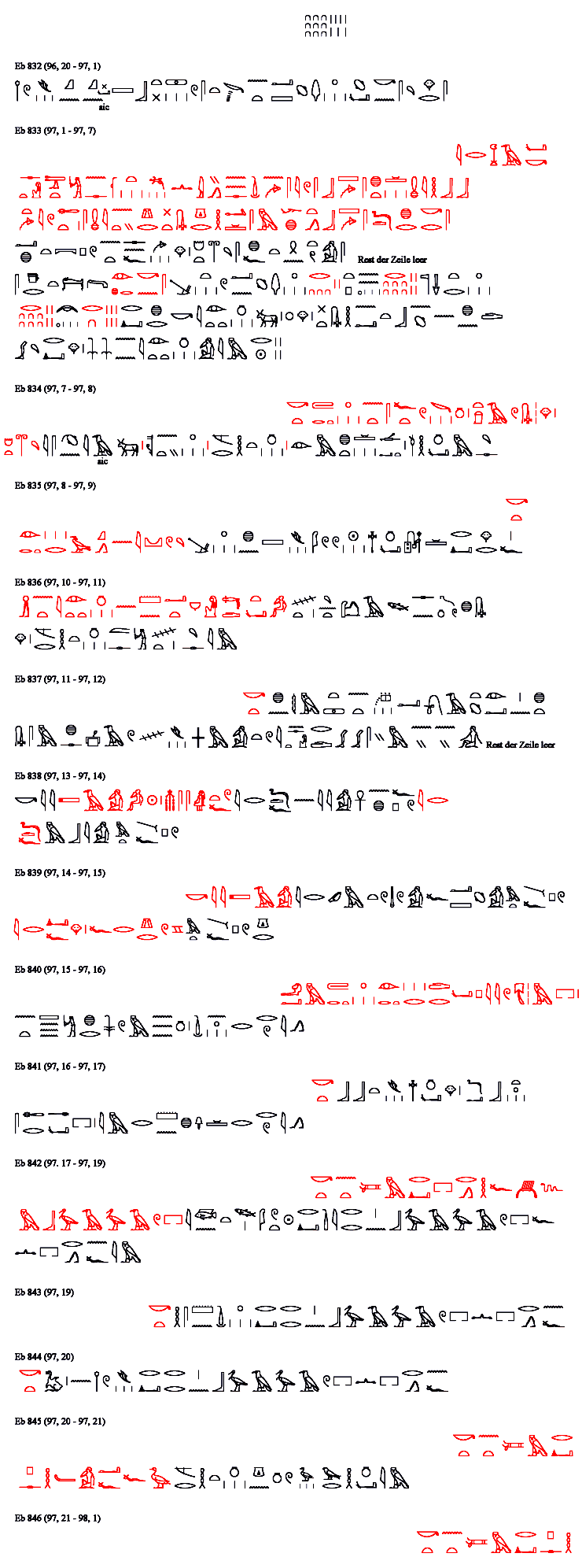 Bemerkungen: 1. In Rezept 833 (Zeile 97, 4) fehlt nach Snt=s der Rest der Zeile; Zeile 97,5 beginnt unvermittelt mit sDr.t oder sDr.tj. Die Übersetzung bleibt hier unklar.
