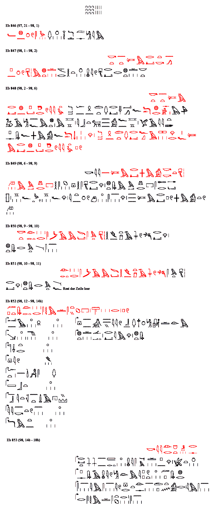 Eb 852 (98, 12 - 98, 14b) {98, 12} Ein Räuchermittel, das gemacht wird, um zu verbessern den Geruch des Hauses oder der Kleidung: {98, 13a} trockenes Myrrhenharz, {98, 14a} prt-Snj-Frucht, {98, 15a} Weihrauch, {98, 16a} Zyperngras, {98, 17a} Holz vom tj-Sps-Baum, {98, 18a} Melone, {98, 19a} Schilfrohr aus Palästina, {98, 20a} ynktn-Mineral, {98, 21a} Dmtn-Mineral, {98, 13b} weicher Teil der Pappel, fein zerreiben, machen zu {98, 14b} einer einheitlichen Masse, geben davon ins Feuer.