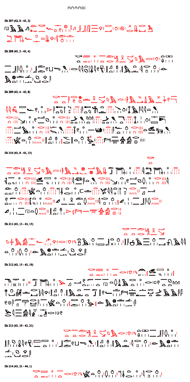 Eb 210 (43, 8 - 43, 13) Ein anderes [Heilmittel] {43, 9} für das Beseitigen einer Verstopfung in der rechten Hälfte durch Löschen: Feigen 1/8, jSd-Frucht 1/8, {43, 10} osntj 1/16, Rosinen 1/16, jnst-Pflanze 1/16, Früchte des Wacholders 1/16, {43, 11} Milch 1/8, Honig 1/8, zerriebener Weihrauch 1/8, helles Gummiharz 1/32, {43, 12} geritzte Sykomorenfrüchte 1/16, gelber Ocker 1/32, Blatt der Dornakazie 1/32, Wein 5 ro, Blätter des Christdorns 1/32, {43, 13} Blätter der Sykomore 1/32, Bier 25 ro, nachts dem Tau aussetzen, durchpressen, trinken an vier Tagen.