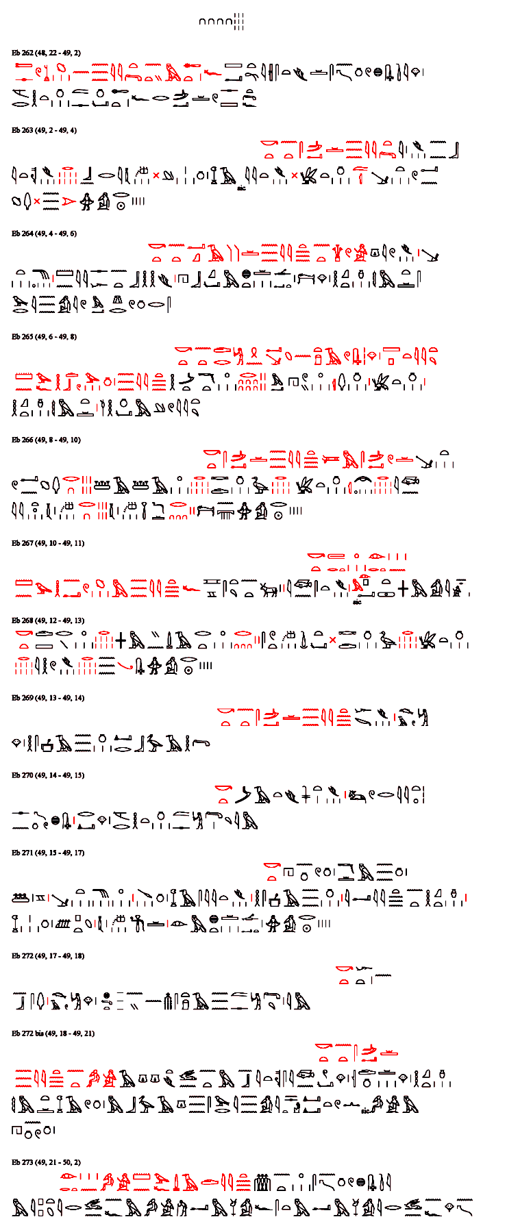 Eb 268 (49, 12 - 49, 13) {49, 12} Ein anderes [Heilmittel]: Körner (des Flachses) 1/8, Inneres der Koloquinthe 1/32, zerstoßener Weizen 1/4, Fett der Gans 1/8, Honig {49, 13} 1/8, jHw-Pflanze 1/8, Wasser 10 ro, kochen, durchpressen, trinken an vier Tagen.