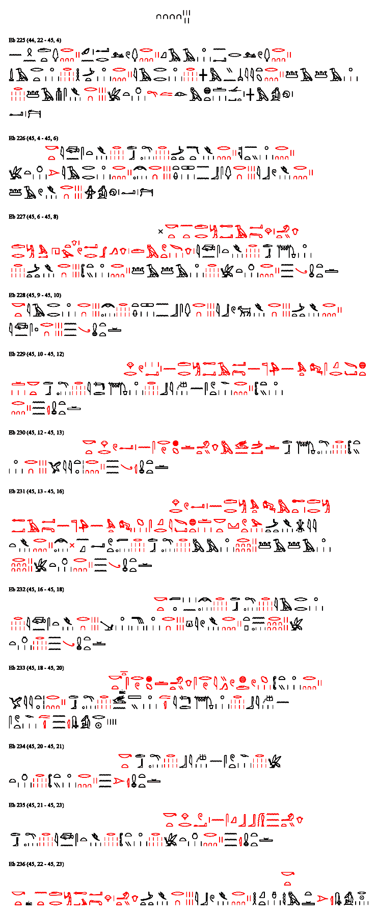 Bemerkungen: 1. Vor Rezept 227 findet sich ein schwarzes Verweiskreuz, das zwischen das schwarze tp-a sDr - "vor dem Schlafen." (Ende Rezept 226) und das rote k.t - "Ein anderes [Heilmittel]" (Beginn Rezept 227) eingeschoben wurde. Hier sind zwei Rezepte als Nachtrag, nämlich Rezept 236 (Zeile 45, 23) und Rezept 237 (Zeile 46, 1), einzuschieben. Ursprünglich endete Kolumne 45 mit dem k.t in Zeile 22 (= Beginn Rezept 238 gemäß Zählung ed. Wreszinski) und wird fortgesetzt mit dem (auch nachträglich hinzugefügten) Hrw-a in Zeile 46, 2. 2. In Rezept 227 (Zeile 45, 7) wurde ein vergessenes jb nachträglich über die Zeile geschrieben. 3. Zu Beginn der Zeile 45, 10 (Rezept 228) wurde das Arzneimittel jnst inkl. der Quante 1/32 offensichtlich gedrängt und in etwas verstümmelter Form nachträglich eingefügt. Gelöscht wurde hier zuvor das Quantum 1/32 zu mAtt aus Zeile 45, 9, welches dann anschließend an Zeile 45, 9 angehängt wurde. 4. In Rezept 233 (Zeile 45, 18) wurde nachträglich ein ausgelassenes n.t über die entsprechende Stelle geschrieben.