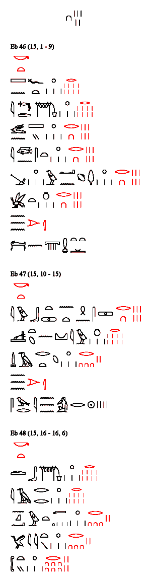 Eb 48 (15, 16 - 16, 6) {15, 16} Ein anderes [Heilmittel]: {15, 17} Feigen 1/8, {15, 18} Weinbeeren 1/8, {15, 19} geritzte Sykomorenfrüchte 1/32, {15, 20} Gummi 1/32, {15, 21} gelber Ocker 1/64, ...