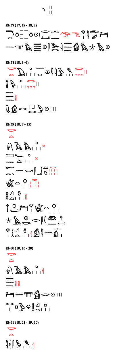Eb 59 (18, 7 - 18, 15) {18, 7} Ein anderes [Heilmittel]: {18, 8} wAm-Pflanze 1/4, {18, 9} Snft 1/4, {18, 10} Xr-Teil vom ksbt-Baum 1/8, {18, 11} Honig 1/8, {18, 12} Bier 5 ro, {18, 13} zerreiben, die Nacht auf Honig verbringen, {18, 14} früh aufstehen, um zu verreiben {18, 15} in Bier 5 ro, trinken durch den Mann.