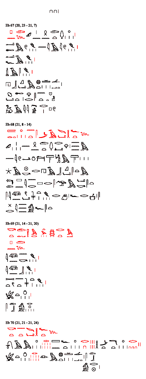 Eb 67 (20, 23 - 21, 7) {21, 1} ... einen pnd-Wurm: Blatt der Dornakazie 1, {21, 2} Blätterzweige der njAjA-Pflanze 1, {21, 3} afA-Pflanze 1, {21, 4} DAjs-Pflanze 1, {21, 5} zerstoßen zu einer einheitlichen Masse, {21, 6} verbinden damit den Bauch der Frau {21, 7} oder des Mannes.