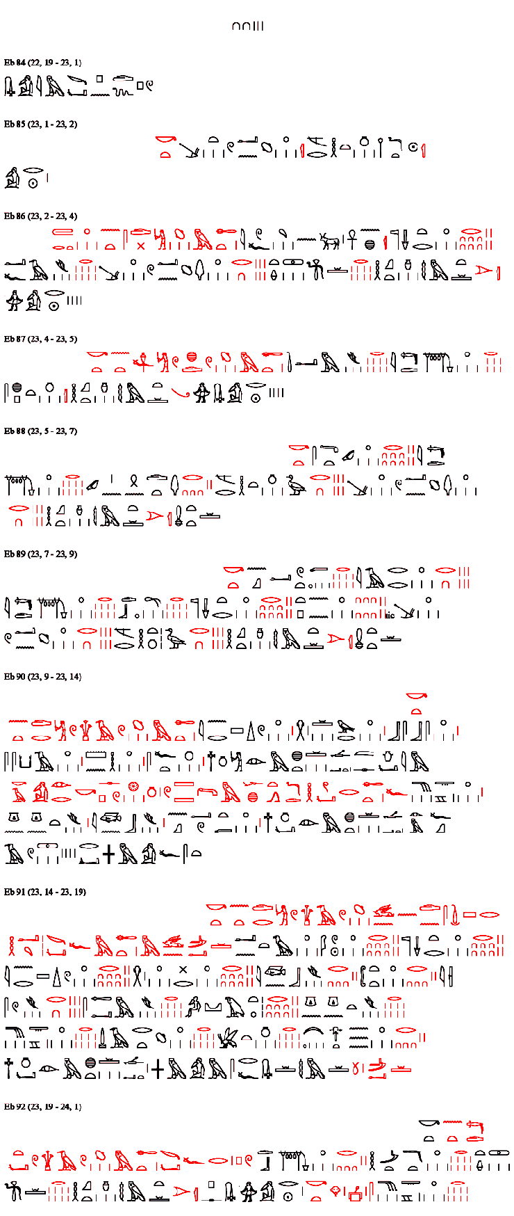 Eb 91 (23, 14 - 23, 19) Ein anderes [Heilmittel] für das Beseitigen der wHAw-Hautkrankheit, die gegen {23, 15} den Körper lastend ist und das sie Töten in Wirklichkeit: trockenes Myrrhenharz 1/64, Weihrauch 1/64, {23, 16} jnr-spdw-Mineral 1/64, sA-wr-Harz 1/64, jnb-Pflanze 1/32, gelber Ocker 1/32, {23, 17} Schilfrohr 1/16, saAm-Pflanze 1/8, Bleiglanz 1/64, gngnt-Pflanze 1/8, {23, 18} Snj-tA-Frucht 1/8, Koloquinthe 1/8, Honig 1/8, Erdmandelknollen 1/32, {23, 19} zerreiben, machen zu einer einheitlichen Masse, essen in angenehmer Wärme. Eine erfolgreiche Methode.