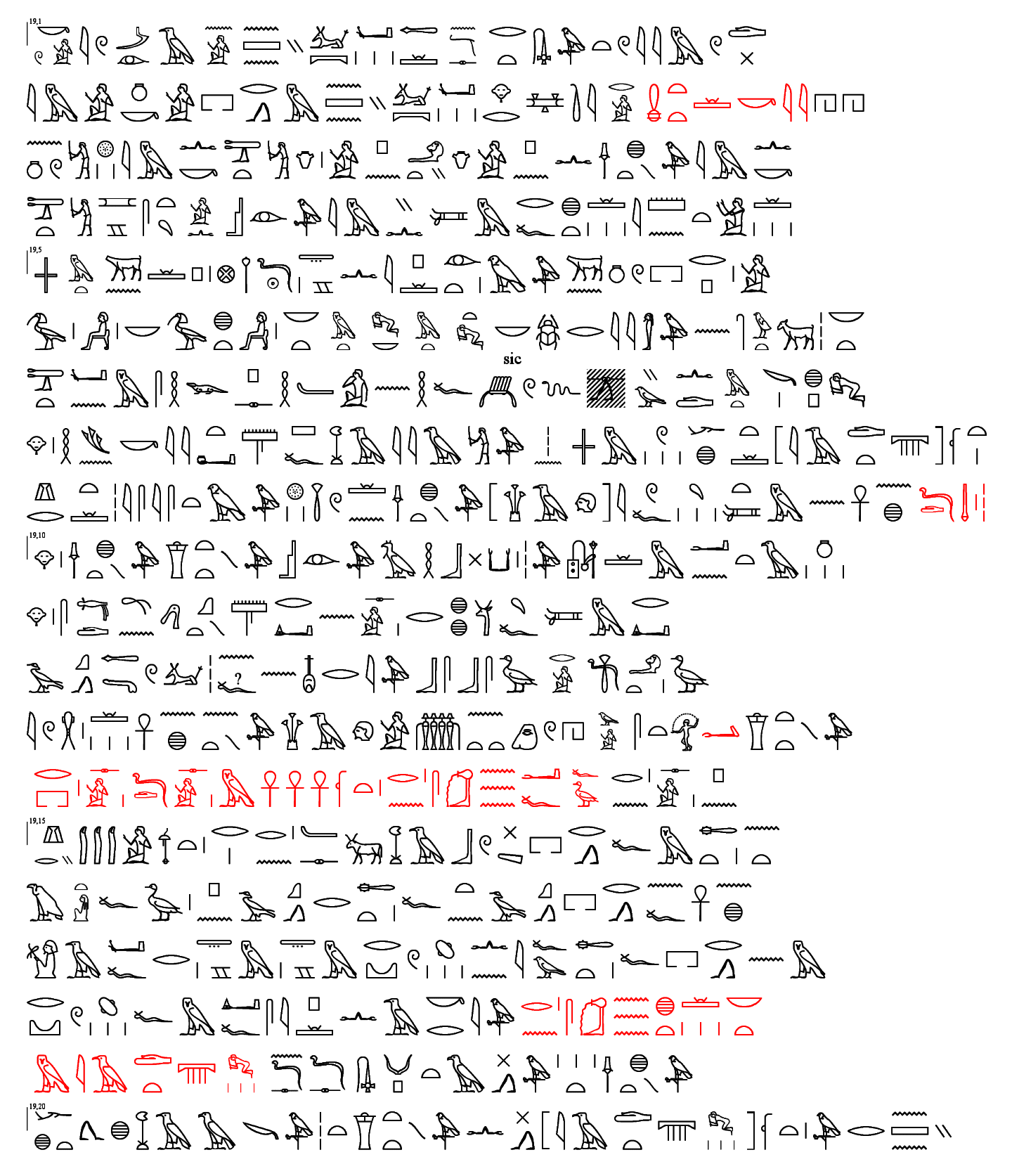 Ein anderer [Spruch/Schutzzauber]: {19, 3} (Oh,) Jauchzender-und-Jubelnder! – zweimal (zu sprechen) – Du sollst nicht wegnehmen dieses mein jb-Herz und dieses mein HAtj-Herz für Sachmet! Du sollst nicht {19, 4} wegnehmen [diese] meine Leber für Osiris! Nicht sollen doch zugrundegehen die verborgenen Dinge, {19, 5} die im Inneren von Pe (=Buto) sind am Anbruch des Tages des Überprüfens des Horusauges. Die Residenz (wurde) zu meinem Sitz. {19, 6} (Oh,) jeder (männliche) Ach-Geist, jeder (weibliche) Ach-Geist, jeder Tote, jede Tote, (göttliche) Gestalt eines jeden Kleinviehs, {19, 7} der vom Krokodil Gepackte, der von der Schlange Gebissene, der durch das Messer Dahingeschwundene(?), der auf seinem {19, 8} Bett Verstorbene und (ihr) Messerdämonen im Gefolge der Jahres[seuche] {19, 9} sowie (all) dessen, was sie erbringt. Nun, Horus – zweimal (zu sprechen) – Sproß der Sachmet, ist [um] mein Fleisch [herum] das ganze Leben lang. Worte zu sprechen {19, 10} über (Bildern von) Sachmet, Bastet, Osiris und Nehebkau, die gezeichnet sind mit Myrrhenharz {19, 11} auf eine Binde aus feindem Leinen. Geben dem Mann an seinen Hals, [um] nicht zuzulassen, {19, 12} daß Esel eindringen (können). (Oh,) Nefri, die bsbs-Ente ist bei mir und die “Grünbrust”-Ente, {19, 13} indem der lebendige Schutz(zauber) der Neith um mich herum ist, die Gebieterin über das, was den Säenden (aus der Hand) entgleitet. [Dies bedeutet] ein Abwehren der Bastet {19, 14} vom Haus des Mannes. Es möge der Mann sprechen (diesen Spruch) als Jahresbeschwörung.