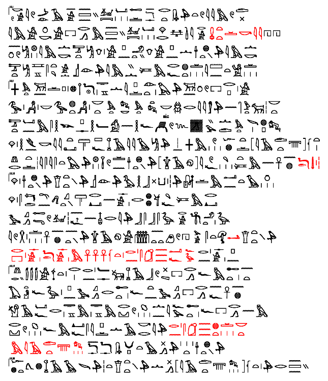 Spruch für das Reinigen irgendeiner Sache {19, 19} von der Seuche: Es mögen verbrennen Deine Boten, (oh) Sachmet! {19, 20} Es mögen zurückweichen Deine Messerdämonen, (oh) Bastet! Nicht möge vorbeiziehen die Jahres[seuche], um zu wüten ...