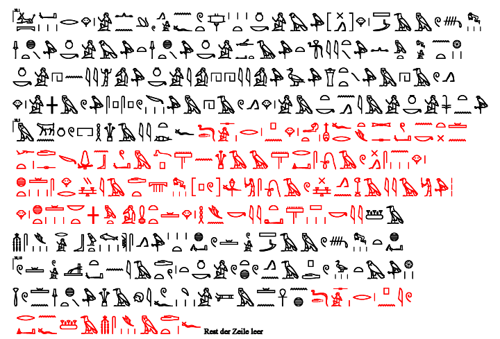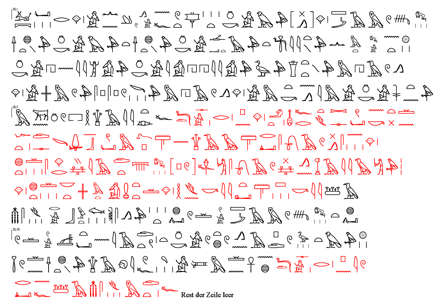 {20, 1} ... gegen mein Gesicht! Nicht möge mich erreichen Dein (böser) Hauch! Ich bin Horus, [der vorbeizieht] an den “Umherirrenden” (=Krankheitsdämonen) {20, 2} der Sachmet! Ich bin Dein Horus, (oh) Sachmet! Ich bin Dein Einziger, (oh) Wadjit! Nicht möge ich sterben durch Dich – zweimal (zu sprechen)! {20, 3} Ich bin der Jubelnde! Ich bin der Jauchzende, der Sohn der Bastet! Nicht stürzt (euch) {20, 4} auf mich, (ihr) jmj.w-spsp.w (=Art Dämonen)! Nicht stürzt (euch) auf mich, nicht kommt mir (zu) nahe! Ich bin der König {20, 5} im Inneren seines HAjt! Es möge der Mann diesen Spruch sagen vor der nfr.t-Pflanze (=Kronen-Wucherblume, Chrysanthemum coronarium?), es werde angeknotet ein wenig vom {20, 6} xt-ds-Baum und (das Ganze dann) eingewickelt in ein Tuch aus feinem Leinen. Dann möge (man) die (=die Zutaten) vorbeistreifen lassen über {20, 7} der Sache (=die von der Seuche befallen ist). [Das bedeutet] ein Vertreiben der Seuche und ein Abwehren des Vorbeiziehens der Messerdämonen {20, 8} über irgendeiner Sache zum Essen, ebenso über den Betten.