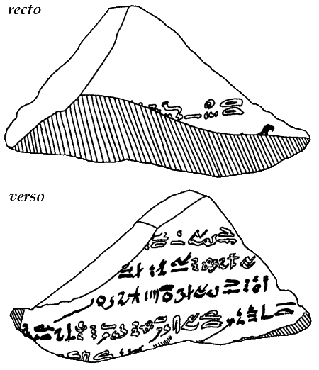 Publikation: Georges Posener “Catalogue des ostraca hiératiques littéraires de Deir el Médineh, Tome I, N.os 1001 - 1108”, 1938, Beschreibung S. 23, Durchzeichnung und Transliteration Taf. 49-49 a.